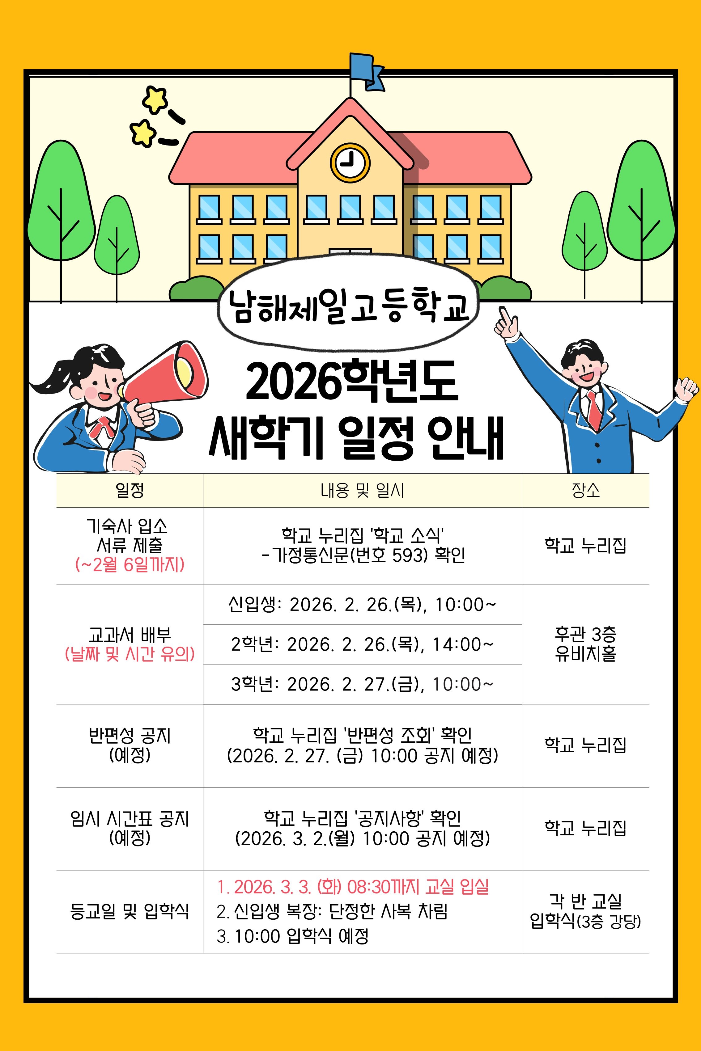 2026학년도 남해제일고 새학기 일정 안내